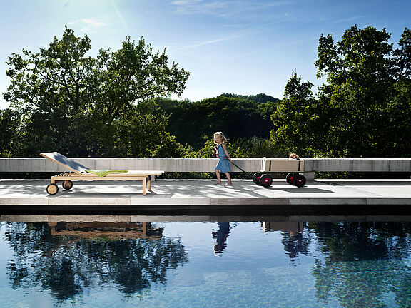 Filigran und dank des abgerundeten und mit zwei Rollen ausgestattetem Edelstahlgestells perfekt, um im Garten immer wieder neue Lieblingsplätze zu entdecken, bietet die Sonnenliege Prato von Weishäupl eine wetterfeste Liegefläche mit verstellbarem Kopfteil. Eine passende Polsterauflage sowie eine passende Gartenmöbelserie finden Sie ebenfalls über Weishäupl.