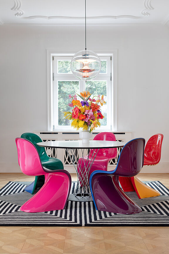 In enger Zusammenarbeit mit der Familie Panton entwickelt, ist der zweifarbige Stuhl auf 999 Exemplare limitiert, die mit einem Label als «Limited Edition» gekennzeichnet sind. Zu beziehen ist der Panton Chair Duo über wenige ausgewählte CI-Häuser.